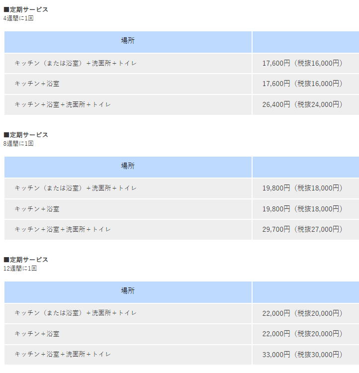 いつも清潔な空間をキープしたいという方には4週間に1回。普段はご自身でお掃除をしながら、定期的にプロに徹底的にキレイにしてほしいという方には2ヵ月に1回、3ヵ月に1回といったように、ご希望に合わせて掃除サイクルをお選びいただけます。