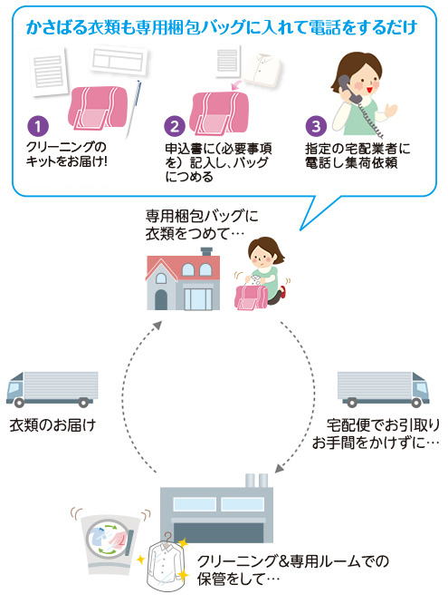 宅配クリーニング「ハナコロモ」ならクリーニングに出したい大量の衣類があっても、申込書に記入し専用梱包バッグに詰めて電話するだけ。忙しくてクリーニング店にいけないときでも、宅配便でお引取り&お届けだからラクラク!