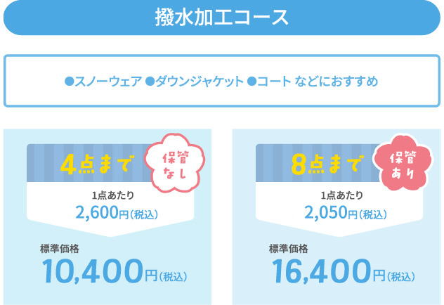・撥水加工コースでは、セーターやカーディガンなどのニット製品をはじめ、撥水効果が期待できない品物もございます。あらかじめご了承ください。