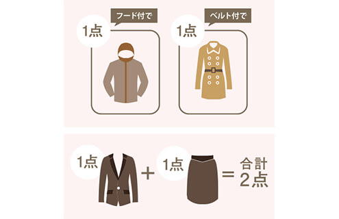 付属品(取り外し可能なフードやコートのベルト・インナー等)は1点としてカウントしないため、服にセットとして出していただくことは可能です。スーツの上下等は、それぞれ1点ずつカウントします。