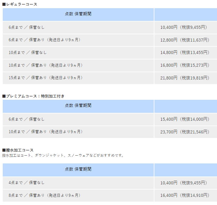 ・保管付き及びプレミアムコース、撥水加工コースの場合に限り、礼服、制服類(急なご利用にお届けできない品物)